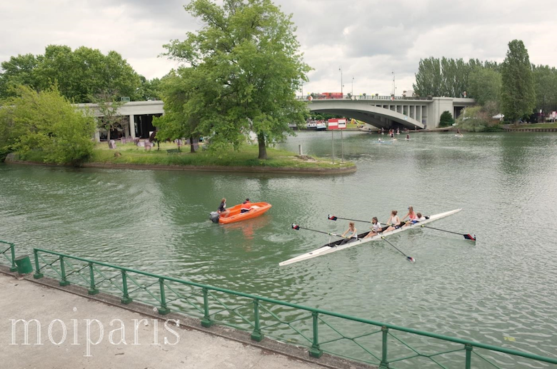 セーヌ川よりも穏やかな流れのマルヌ川は、昔からボート競技も盛んなんです。 この日もボートの訓練や舟遊びの人たちの姿が。