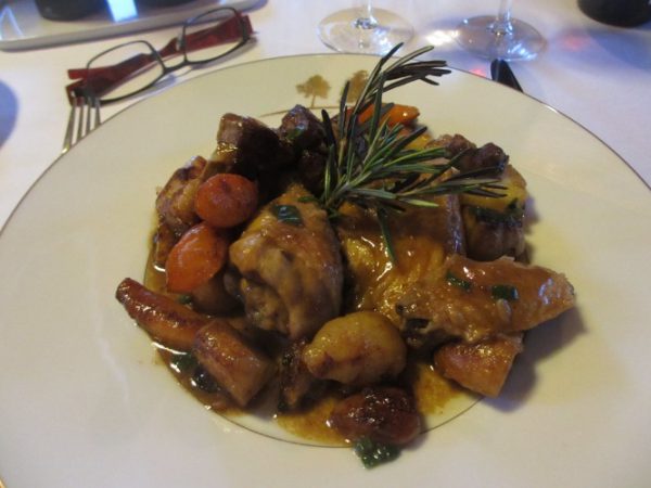 彼はフリカッセ ドゥ プレ(鶏肉の煮込み料理)をチョイス。パサパサになりがちな鶏肉もしっとりしていて、付け合せの野菜と共にこちらもすごいボリューム!
