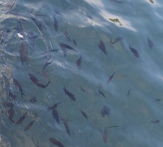 青い海を覗くと、小魚がたくさん泳いでいて、パンくずを投げ入れれば、小さな魚たちがワッと集まってきます。