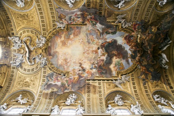 ジュズ教会の見どころといえば、天井画のジョバンニ・バッティスタ・カウッリ策の「イエスの御名の勝利」を描いたフレスコ画です。教会の天井を見上げてみてくださいね。 立体的に描かれていてどこからが絵でどこまでが彫刻なのか?首が痛くなるくらい見とれてしまう為、教会のほうでは大きな姿見の鏡を置いてそこから天井画を見下ろすことができます。