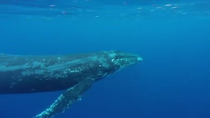 これはそのビデオからのスナップショットです。イルカの3倍以上の大きさでした。尾鰭の裏側が白くて大きい!