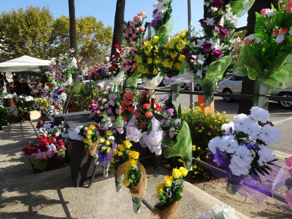 入り口付近のお花屋さんでは、造花や菊の花束が売られています。
